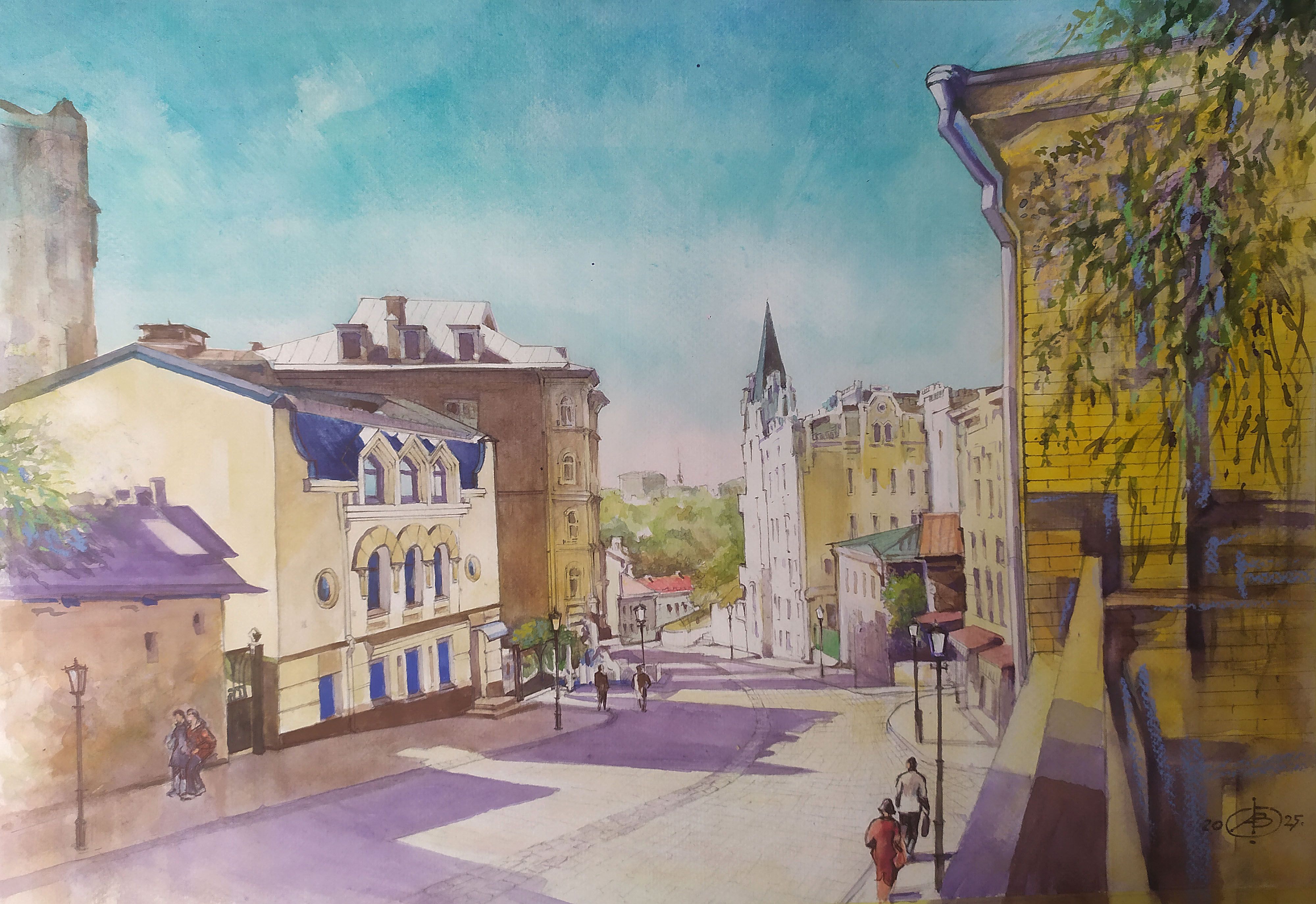 The watercolor was painted under the impression of a visit to Andriyivskyy Descent in Kyiv, Ukraine.
