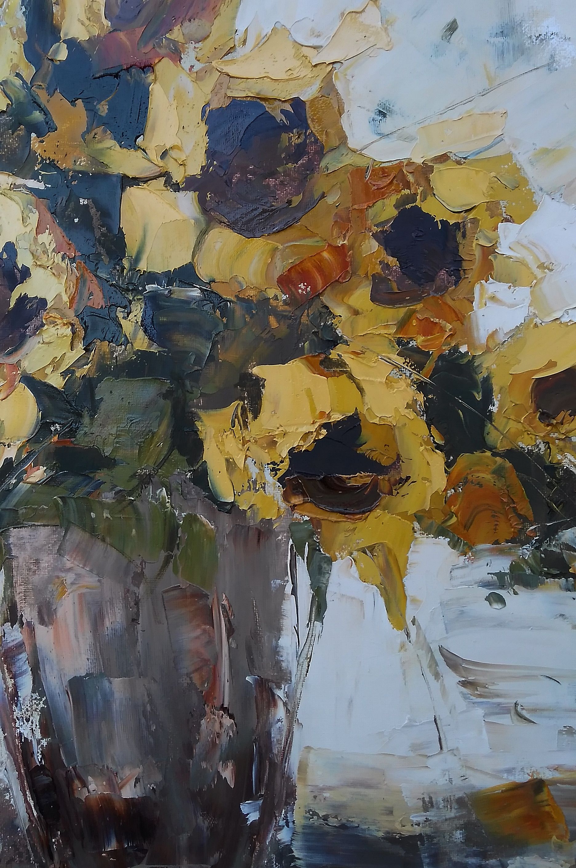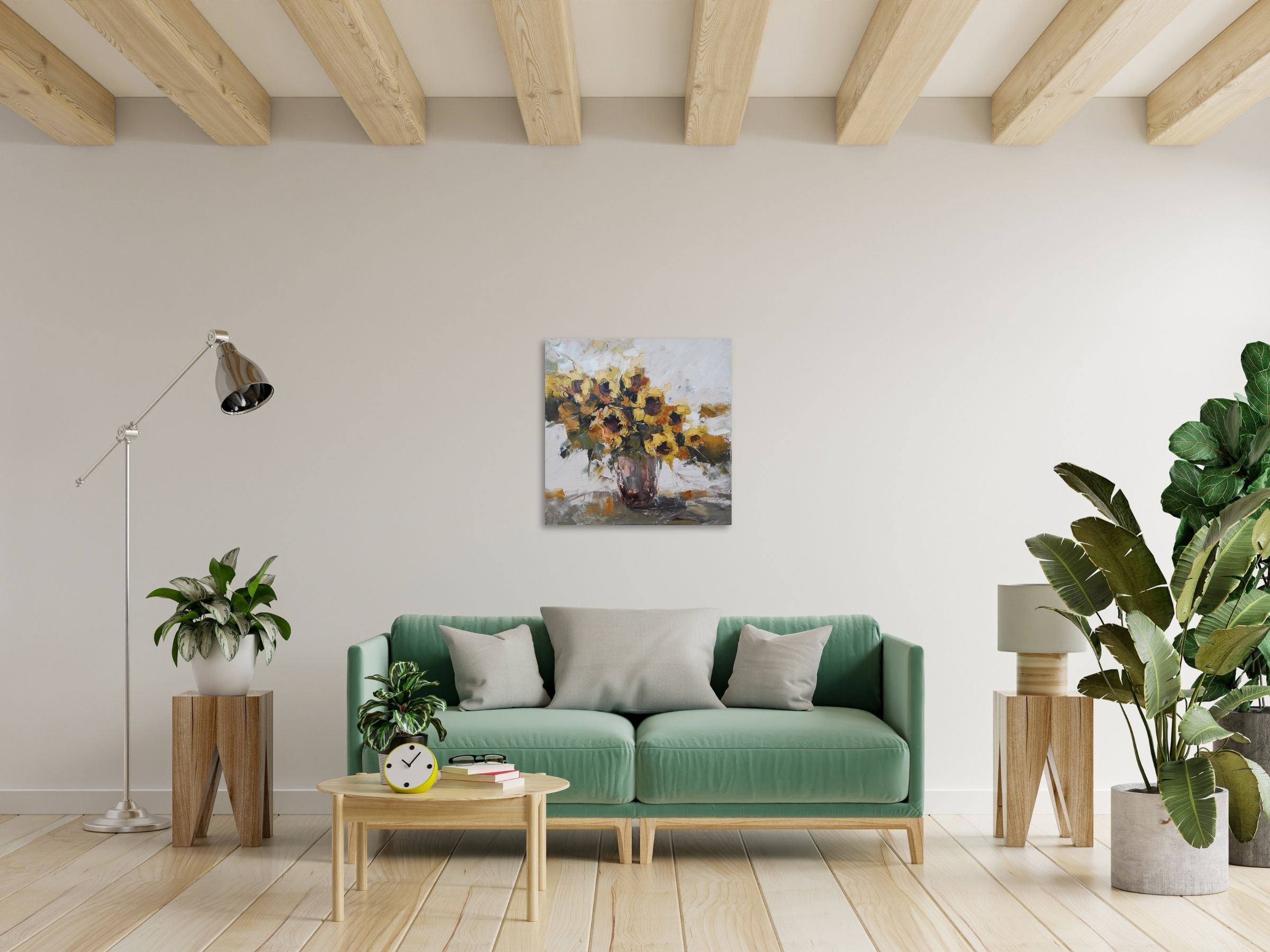 Sunflowers - the symbol of fertility and Earth richness, the eternal flame burning inside the artists soul, the wisest plant that holds hundreds of lives. Mastered in pastel colors, this painting speaks about the inner strength, about the wisdom to be patient, about the beauty of a lover soul. This original oil painting is made on stretched cotton canvas. Size is 60x60cm. Depth 2 cm. Canvas is gallery wrapped and painted on the sides, so the painting could be hang as it is without a frame if preferred. The painting will be sent safely packed within 4 working days after the purchase. A certificate of authenticity will be enclosed.
