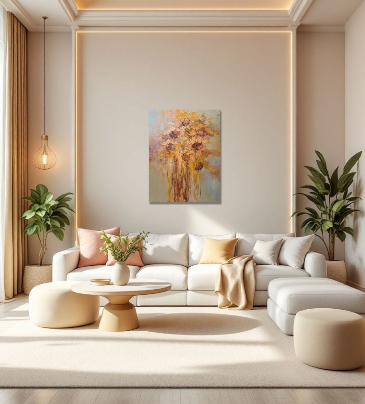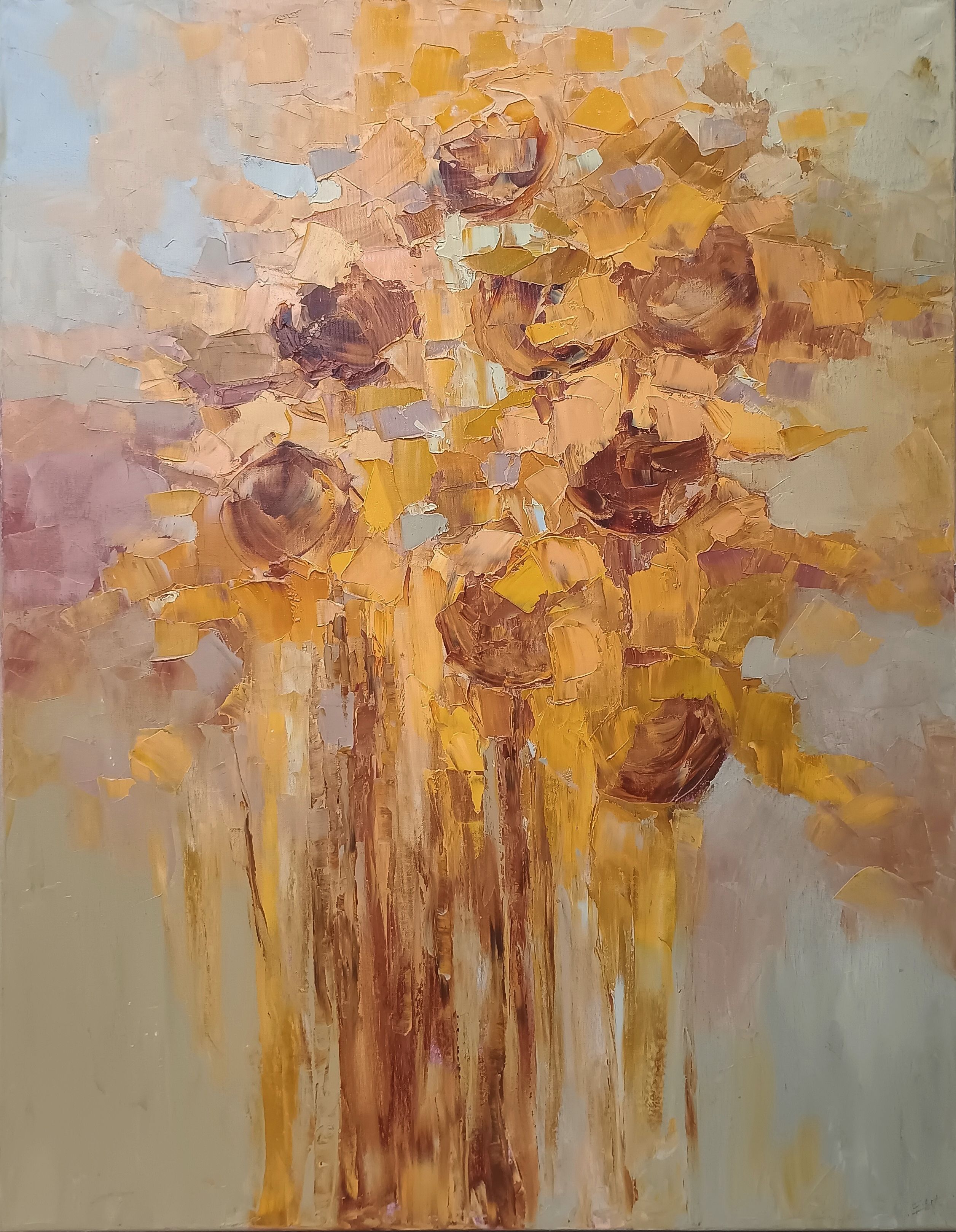 This painting is part of my recent solo exhibition held in my home town and presenting 38 paintings in the theme sunflowers. With this exhibition, I once again say how much I love the earth and its way of existence. All summer I pass by the sunflower field twice a day. I observed their life. I reflected. The sunflower lives only 5 months and experiences so many states, each of them in its true meaning and conscious passion. I saw steadfastness, dedication and confidence. The parallel with our life was inevitable. What do we do with all this time we have. Do we realize how much time we have for so many things. What do we use or waste time for. What states do we fall into. Do we know that we are in them. Hence the name Stops. Because this is how we go through our lives. In a series of stops. And each of them has its own and independent meaning. Every period or even moment, every person we meet, carries something, has a role, has the right time. We stop somewhere or with someone. We stop in some feeling, in some thought, in some state. Do we understand how these states build us. How do we react to them and do we allow them to define us? Do we become them? Do we see how they change us or the people around us? That's why most of the paintings here have names for states. That was my way of making sense of them. Others have names and reflect types. They are permanent states or character traits, so to speak. And I found them in the different stages of the sunflowers. That was a lot of fun. This original oil painting is made on stretched cotton canvas. Size is 70x90cm. Depth 2 cm. Canvas is gallery wrapped and painted on the sides, so the painting could be hang as it is without a frame if preferred. The painting will be sent safely packed within 4 working days after the purchase. A certificate of authenticity will be enclosed.