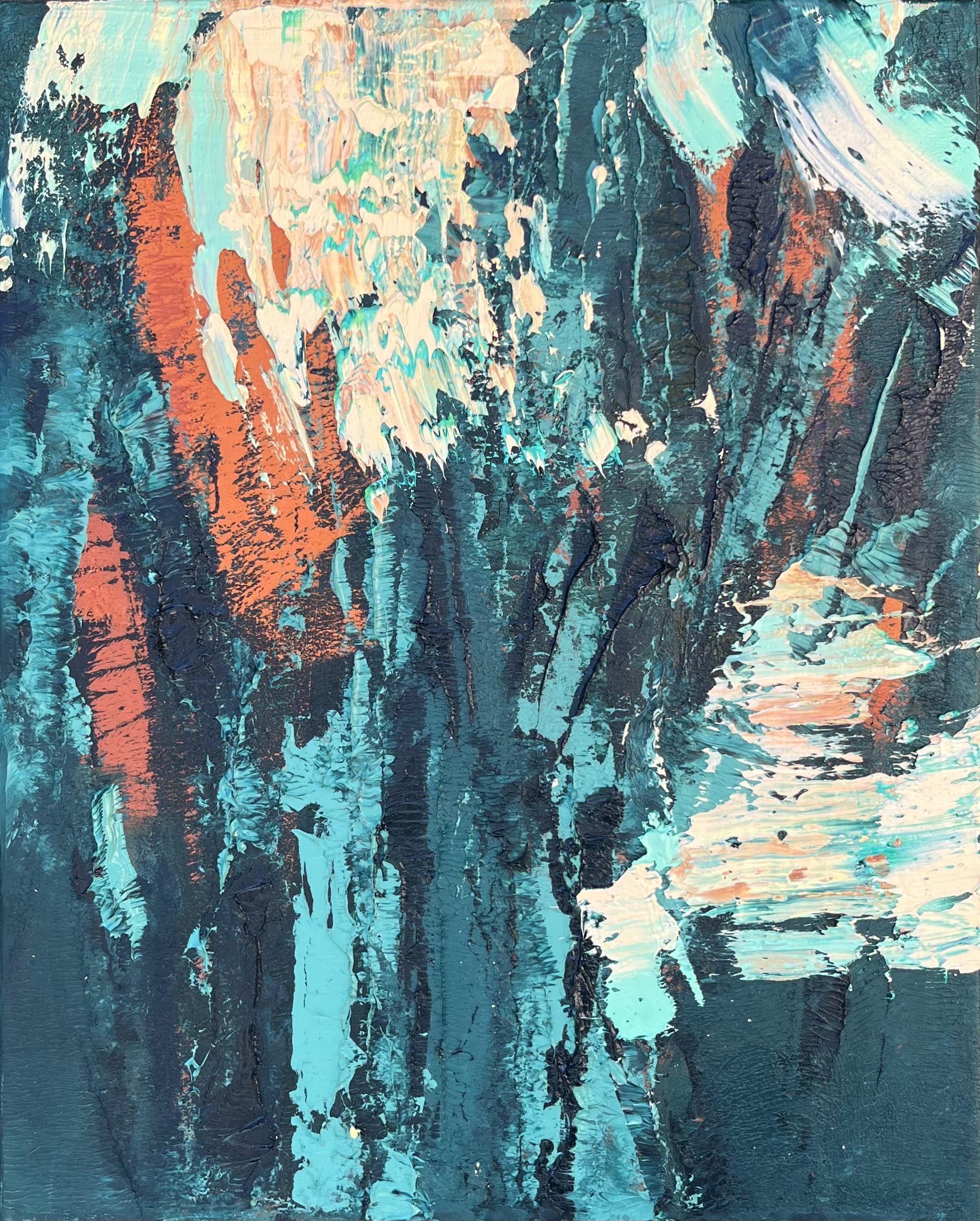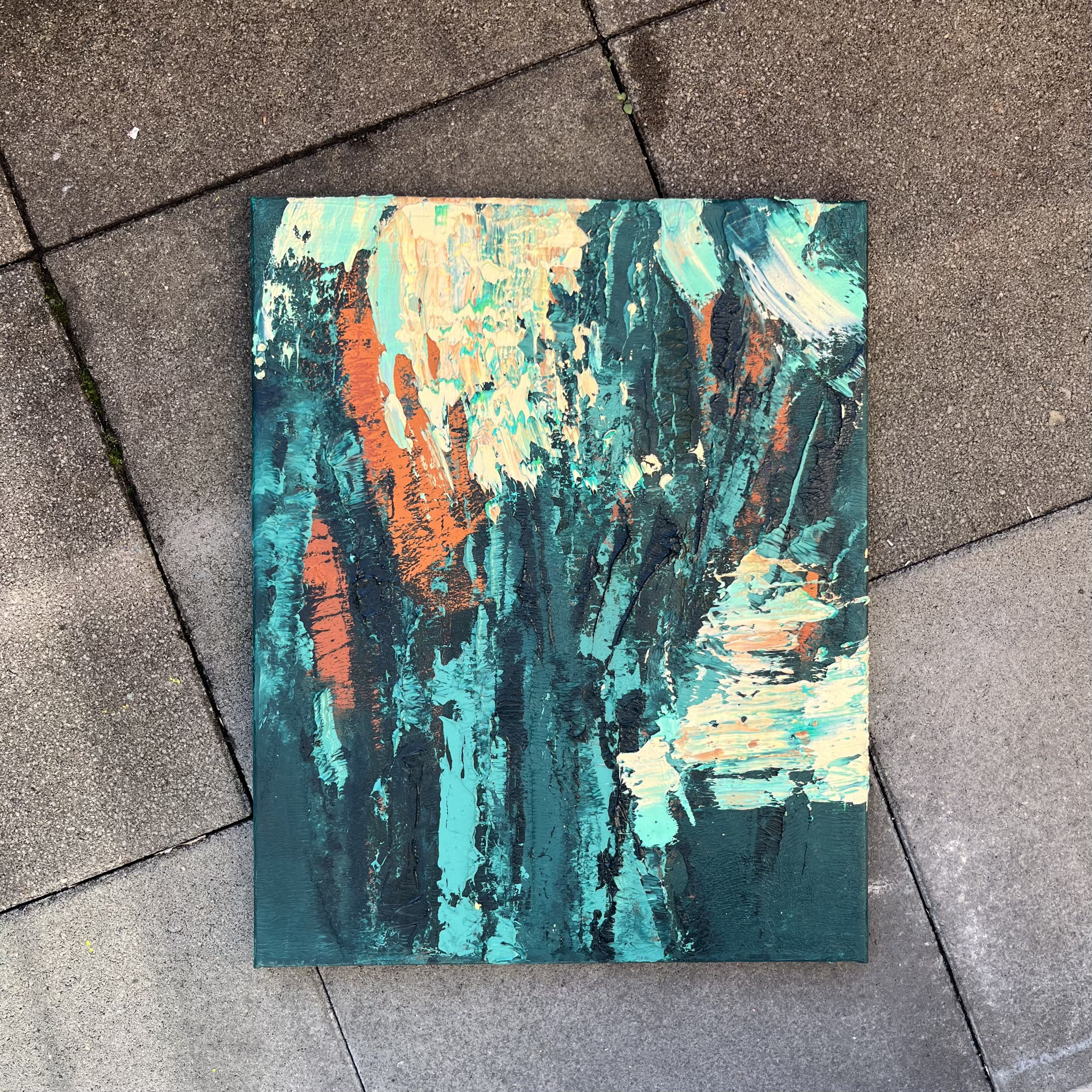 The painting shows the clash of elements through the interaction of rich turquoise, emerald and green with bright accents of ochre and beige. The texture of thick brushstrokes creates the illusion of a natural landscape - branches, leaves, tree bark breaking through the depths of the wilderness, as well as light cutting through the dense forest. This abstraction conveys an intriguing story that took place in the forest. Perhaps someone, breaking through the chaotic green thickets, ends up in a hollow tree, as if in an imaginary world of illusions, inhabited by strange anthropomorphic creatures. The texture of brushstrokes creates dynamics and a sense of movement. This oil painting encourages reflection on the struggle of opposites and harmony in natural chaos, symbolizes the balance between energy and calm.