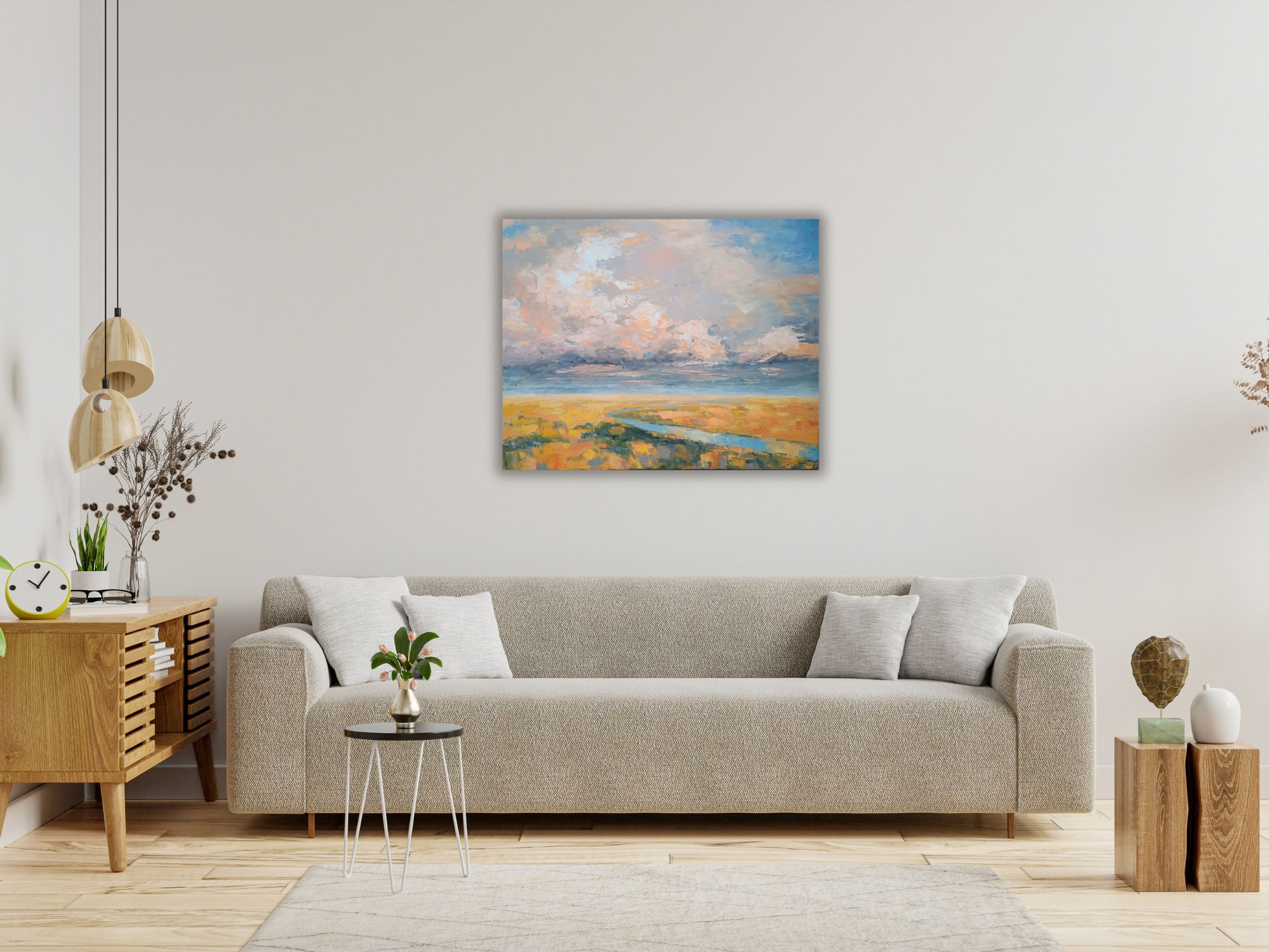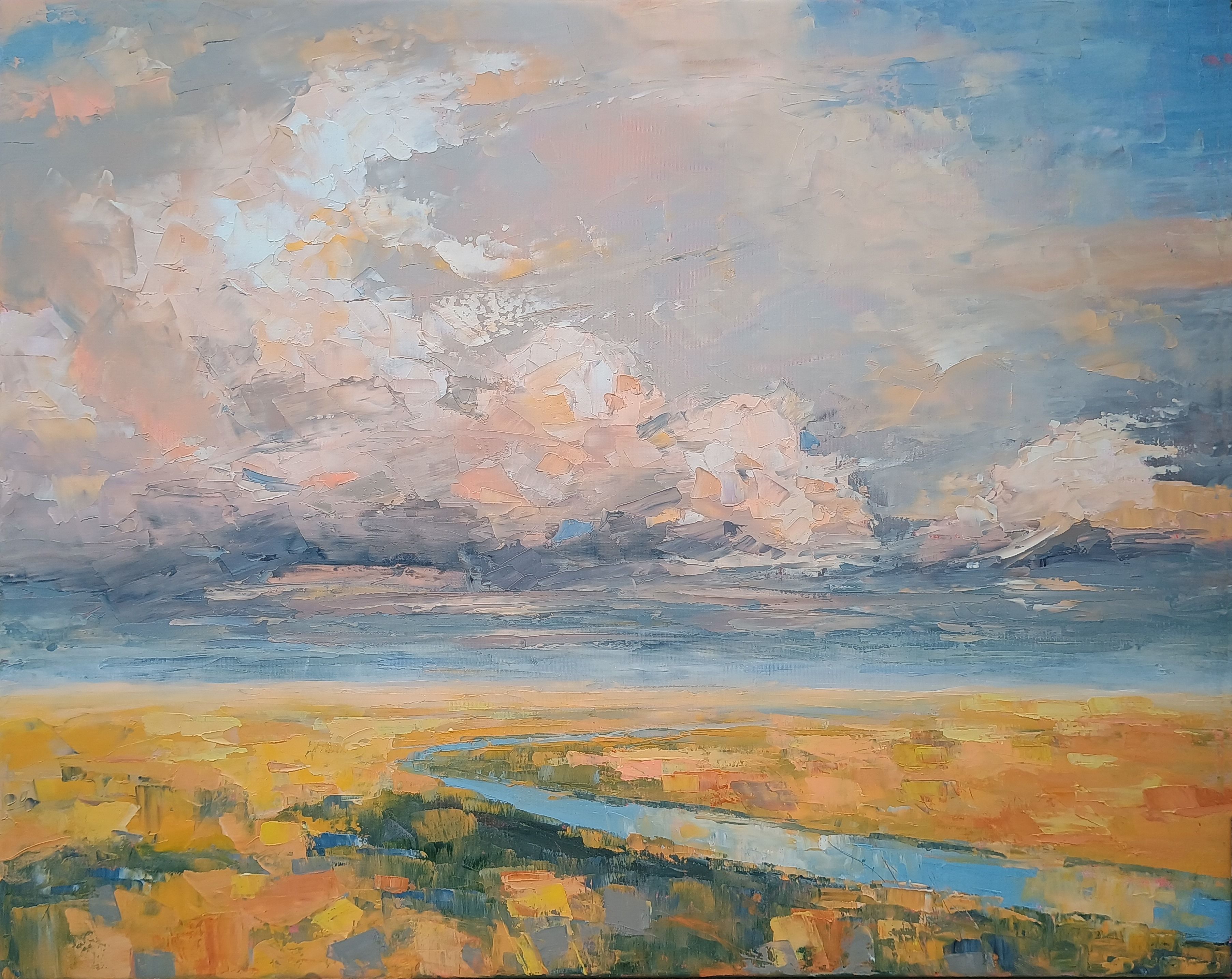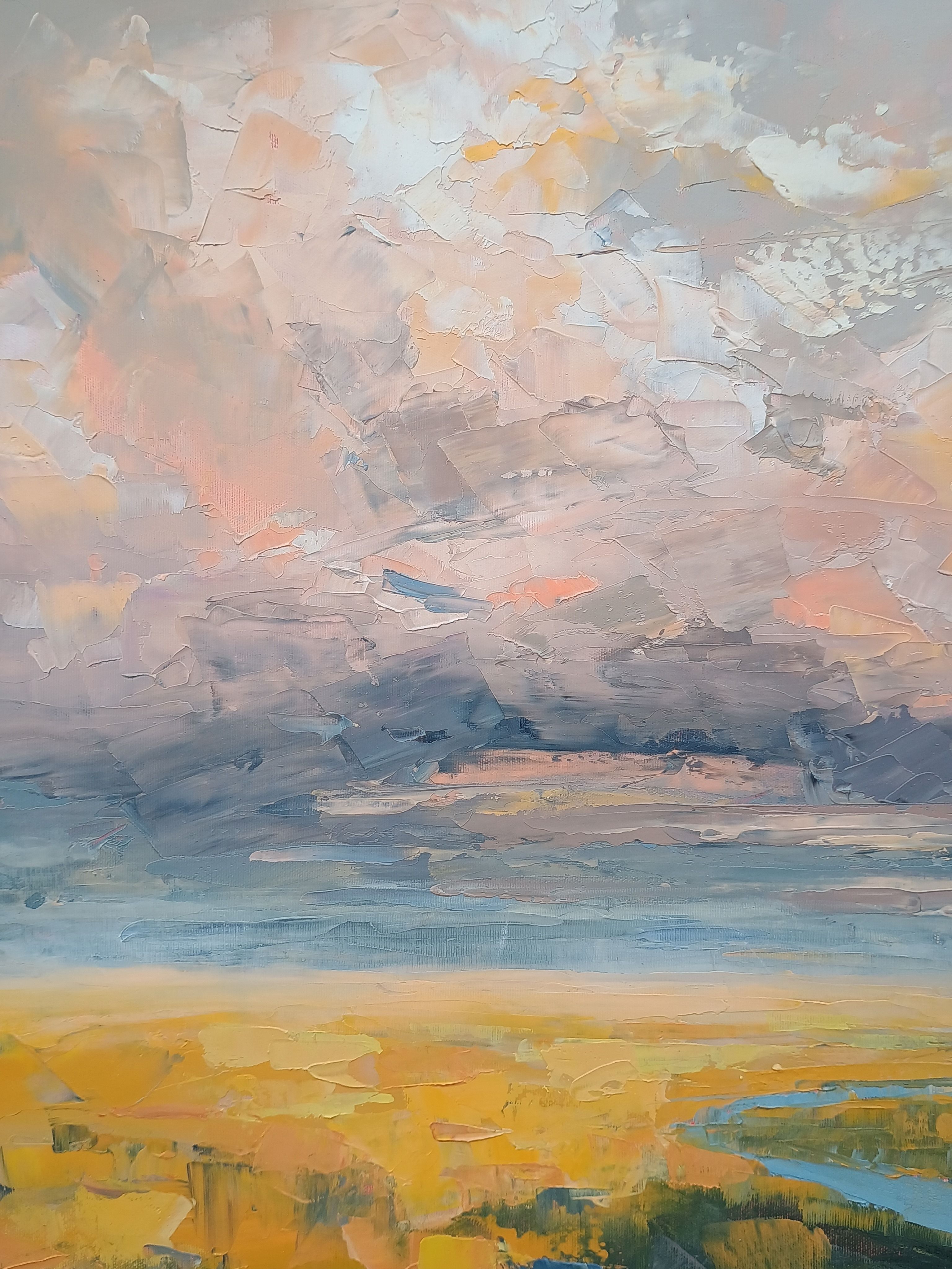 The sky has always intrigued me with its constantly changing scenes, colors and moods. I love clouds and I consider them alive and breathing. I see them free and powerful. I imagine them being in-love, mad, joyful, or just relaxing. I feel them talking with the ground, being connected with all creatures on the land, floating majestically above us all. They amaze me that much to dedicate them a new series of paintings of dramatic skyscapes. This original oil painting is done on stretched cotton canvas. Sides of the painting are painted so it is ready to hang without a frame if preferred. The painting will be sent safely packed within 4 working days after the purchase. A certificate of authenticity will be enclosed.