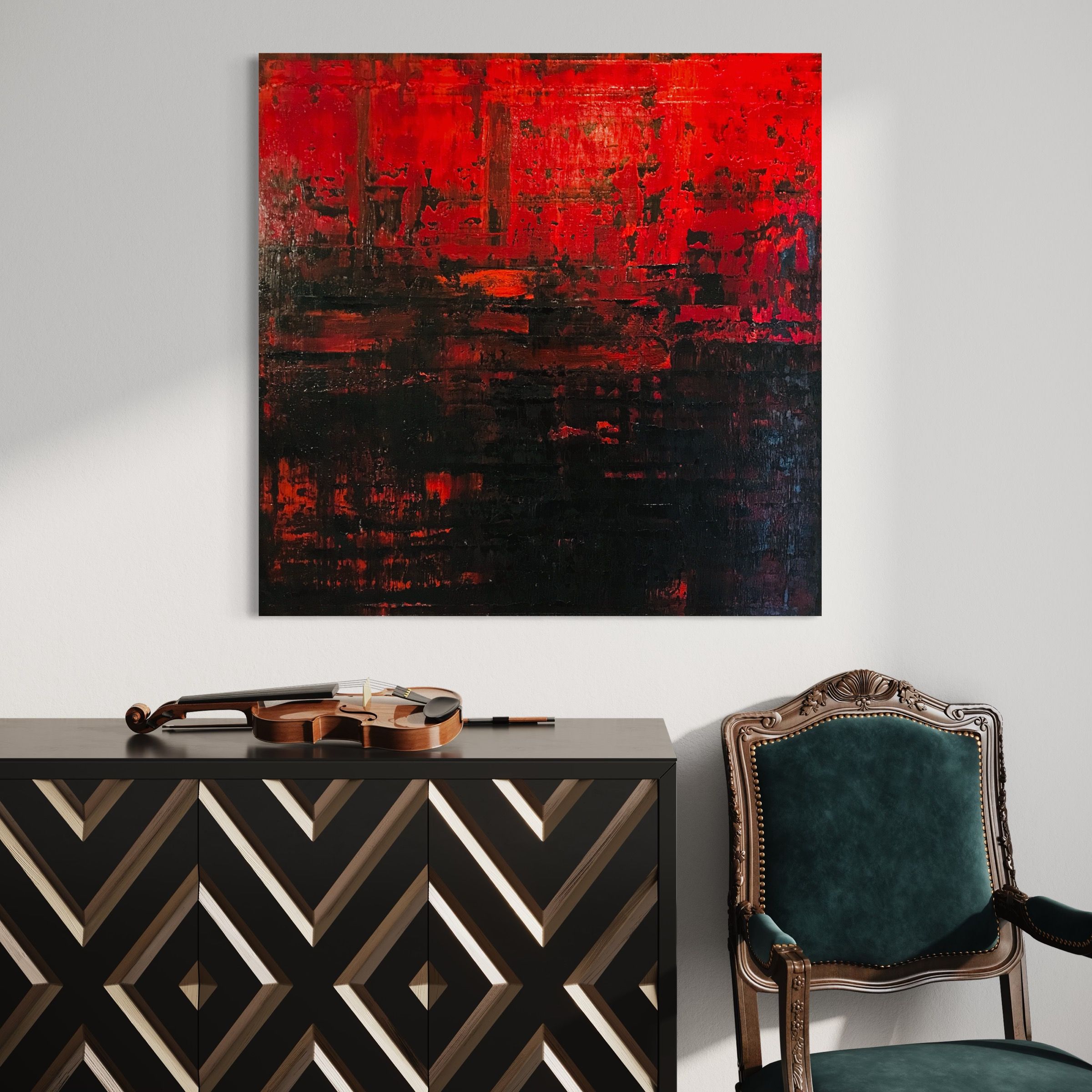 As alarming as justice itself ... This artwork is an emotional exploration through color and texture. With each stroke of my brush, I've infused feelings of passion and depth using vibrant reds against stark blacks. It's meant to evoke a sense of ardent vitality and profound reflection, reminding us of the fierce beauty in resilience and change. Imagine this painting as a bold statement in your space, radiating dynamism and stirring the emotions of all who view it.