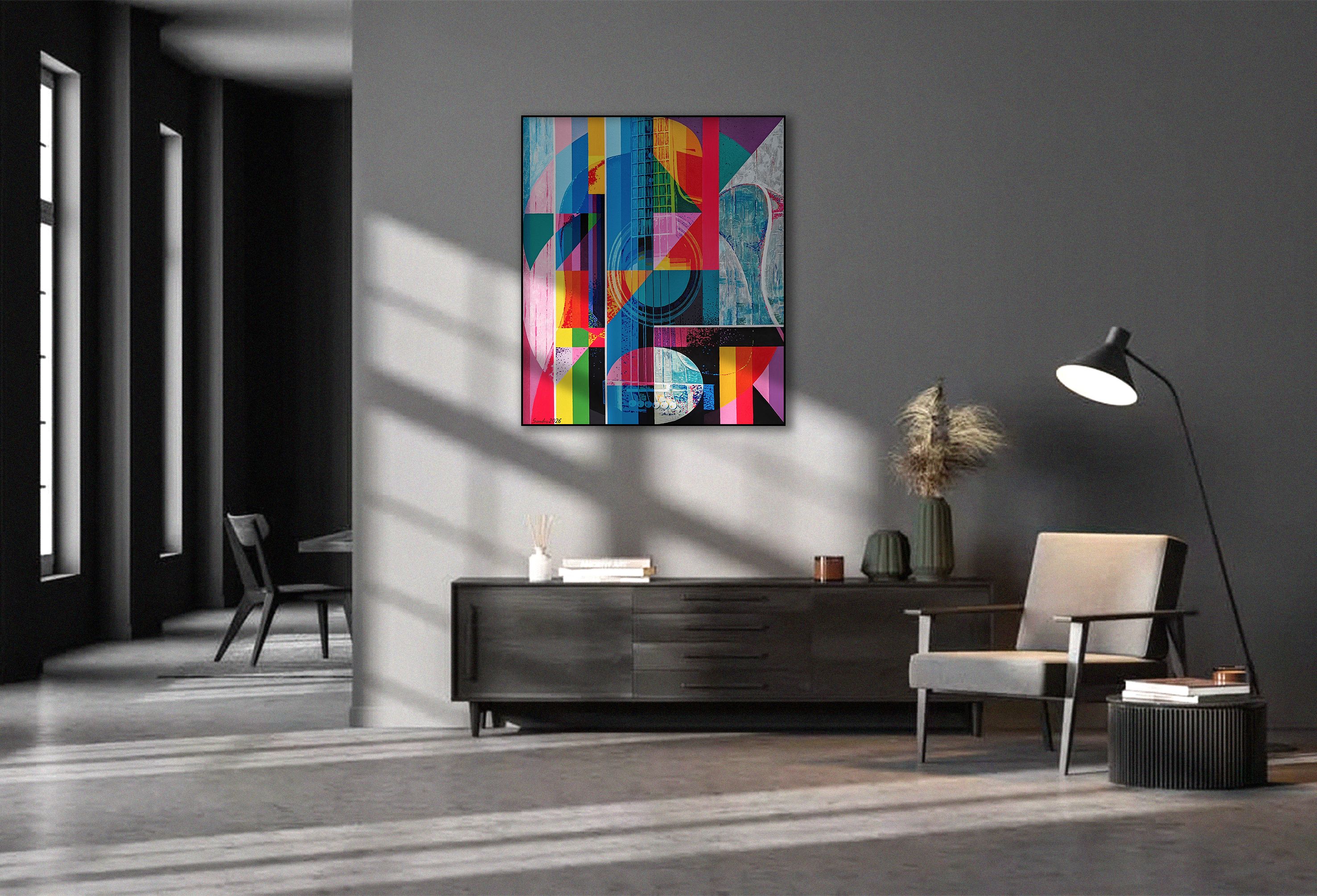 This original abstract painting, "Silent Guitar," captures a moment of pause and reimagination. Bold stripes of color dance across the canvas, bringing a contemporary pop art feel to the abstract expressionism style. The artist uses acrylic on canvas to build and model the image, creating a vibrant and intriguing visual experience. Inspired by a guitar that has been quietly waiting to be played, this piece explores the idea of potential and transformation. The colorful composition invites you to consider the stories behind objects and the beauty that can be found even in stillness. This large artwork would make a stunning focal point in any room. Its abstract subject and dynamic style would complement a modern living room, creative studio, or music-inspired space. Add this unique piece to your collection and let its silent melody resonate within your home.