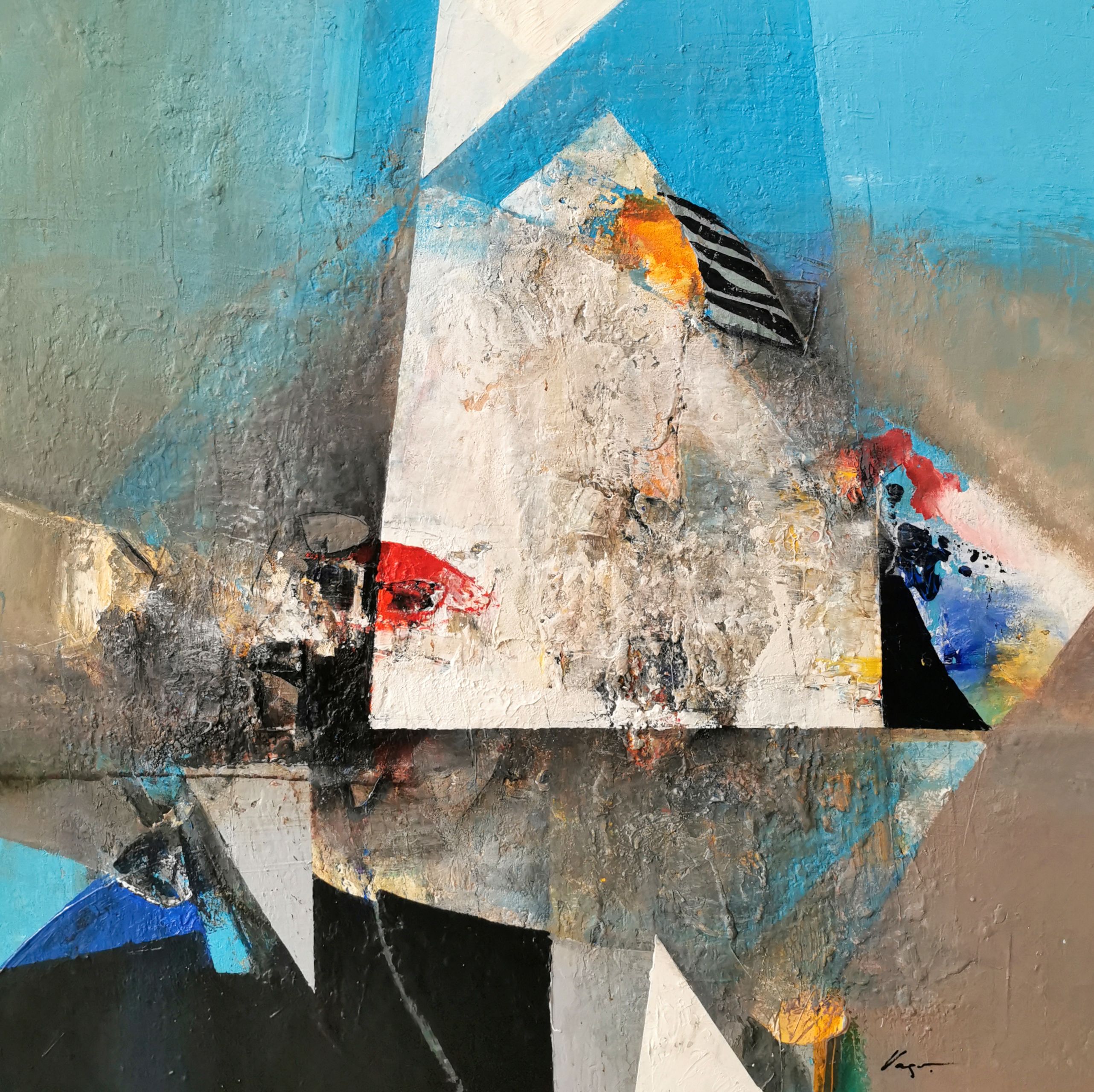 This painting explores the tension between form and decay, between stable structure and its fragility. The geometric volumes are reminiscent of an architectural image—a symbolic home or shelter—which is disrupted, however, by diagonals, stratifications, and expressive matter. The color palette is dominated by cool tones that create a sense of distance and silence, while bright color accents act as emotional breakthroughs in the composition. The surface is highly active – the layering and texture suggest time, memory, and traces of experience. The painting does not seek easy aesthetics, but rather a sustained tension, which is its quality. It works well in the context of contemporary abstract painting and has the potential for a series in which the theme of "structure under pressure" can be developed in subsequent works.