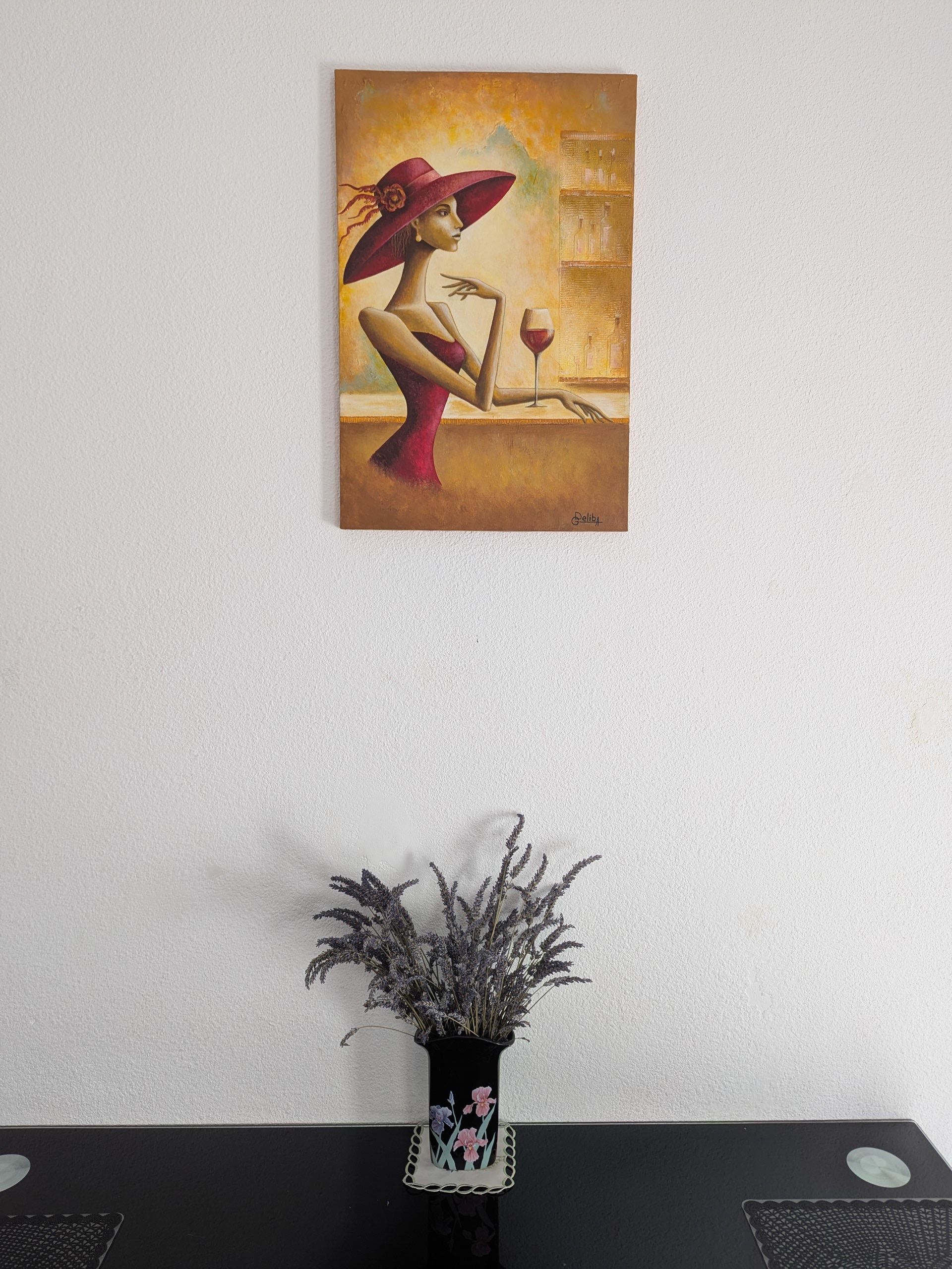 Original Painting An elegant interior artwork created in a warm, noble color palette. The central figure is a graceful woman in a burgundy dress and wide-brimmed hat, seated at a bar counter with a glass of red wine. The elongated proportions of the figure and flowing lines give the composition refinement and a sense of subtle aristocratic charm. The textured background featuring wine bottles evokes the atmosphere of a cozy wine bar and adds depth and dimension to the piece. The combination of golden sand tones with deep burgundy emphasizes warmth, calmness, and sensuality. The painting conveys the mood of a quiet evening, the pleasure of the moment, and inner harmony. It is perfectly suited for decorating a living room, bedroom, wine bar, restaurant, or office, adding style, elegance, and character to the space. Original artist’s work. An ideal choice for collectors and lovers of contemporary figurative art and atmospheric interior accents.
