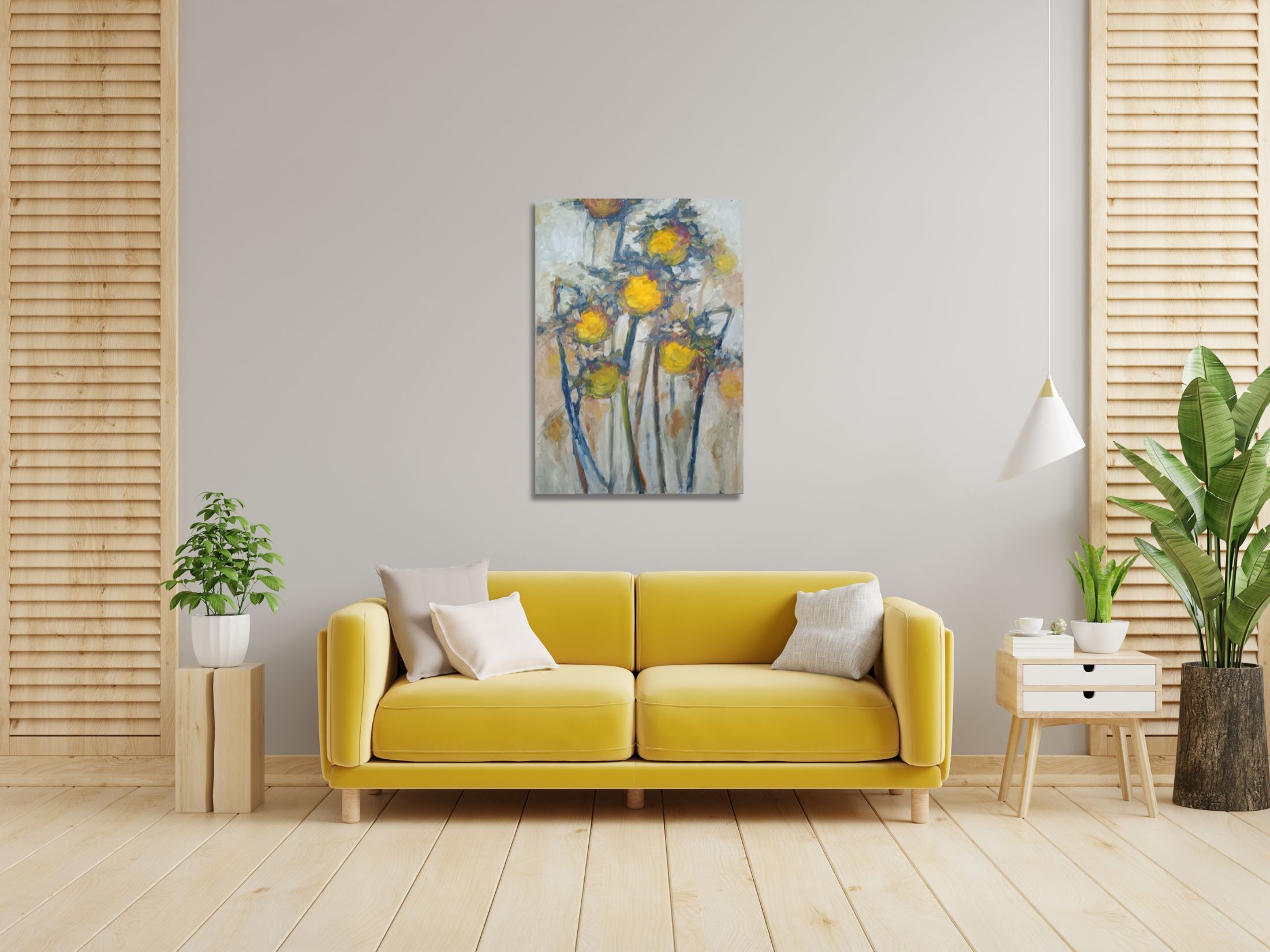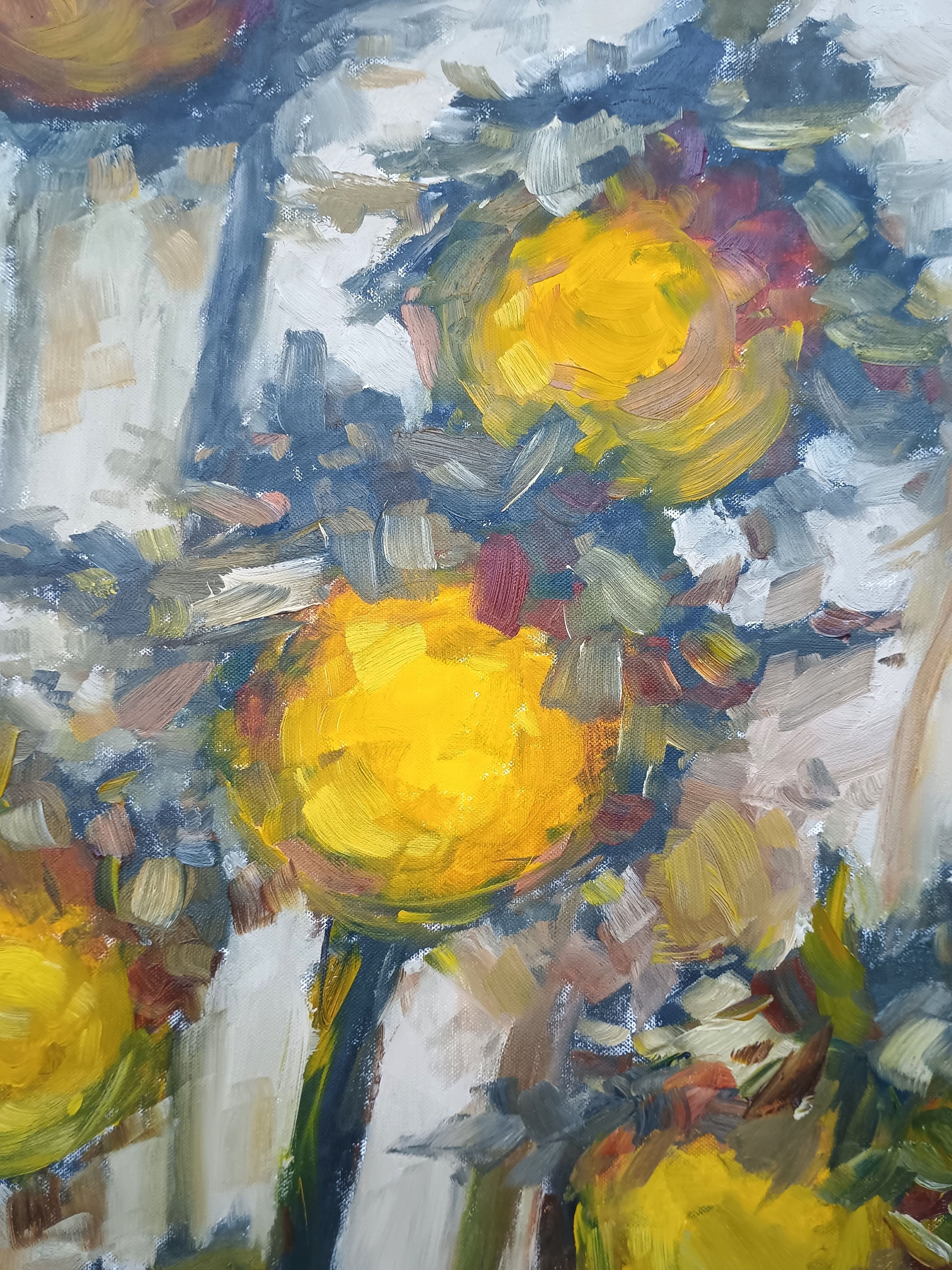 This painting is part of my recent solo exhibition held in my home town and presenting 38 paintings in the theme sunflowers. With this exhibition, I once again say how much I love the earth and its way of existence. All summer I pass by the sunflower field twice a day. I observed their life. I reflected. The sunflower lives only 5 months and experiences so many states, each of them in its true meaning and conscious passion. I saw steadfastness, dedication and confidence. The parallel with our life was inevitable. What do we do with all this time we have. Do we realize how much time we have for so many things. What do we use or waste time for. What states do we fall into. Do we know that we are in them. Hence the name Stops. Because this is how we go through our lives. In a series of stops. And each of them has its own and independent meaning. Every period or even moment, every person we meet, carries something, has a role, has the right time. We stop somewhere or with someone. We stop in some feeling, in some thought, in some state. Do we understand how these states build us. How do we react to them and do we allow them to define us? Do we become them? Do we see how they change us or the people around us? That's why most of the paintings here have names for states. That was my way of making sense of them. Others have names and reflect types. They are permanent states or character traits, so to speak. And I found them in the different stages of the sunflowers. That was a lot of fun. This original oil painting is made on stretched cotton canvas. Size is 70x100cm. Depth 2 cm. Canvas is gallery wrapped and painted on the sides, so the painting could be hang as it is without a frame if preferred. The painting will be sent safely packed within 4 working days after the purchase. A certificate of authenticity will be enclosed.