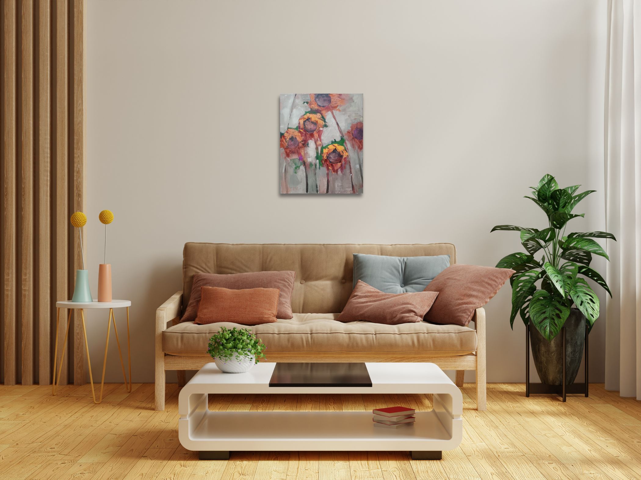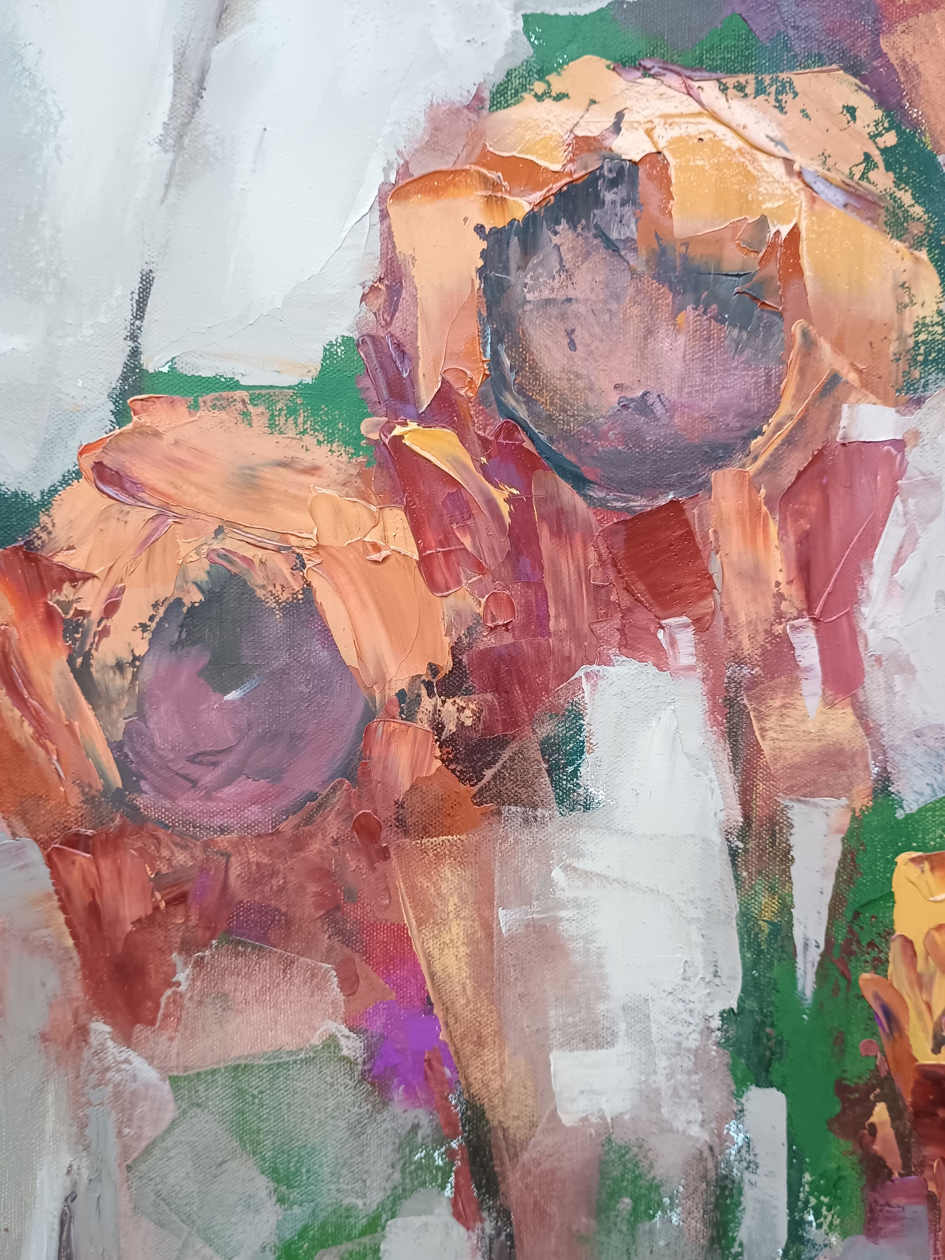 This painting is part of my recent solo exhibition held in my home town and presenting 38 paintings in the theme sunflowers. With this exhibition, I once again say how much I love the earth and its way of existence. All summer I pass by the sunflower field twice a day. I observed their life. I reflected. The sunflower lives only 5 months and experiences so many states, each of them in its true meaning and conscious passion. I saw steadfastness, dedication and confidence. The parallel with our life was inevitable. What do we do with all this time we have. Do we realize how much time we have for so many things. What do we use or waste time for. What states do we fall into. Do we know that we are in them. Hence the name Stops. Because this is how we go through our lives. In a series of stops. And each of them has its own and independent meaning. Every period or even moment, every person we meet, carries something, has a role, has the right time. We stop somewhere or with someone. We stop in some feeling, in some thought, in some state. Do we understand how these states build us. How do we react to them and do we allow them to define us? Do we become them? Do we see how they change us or the people around us? That's why most of the paintings here have names for states. That was my way of making sense of them. Others have names and reflect types. They are permanent states or character traits, so to speak. And I found them in the different stages of the sunflowers. That was a lot of fun. This original oil painting is made on stretched cotton canvas. Size is 50x60cm. Depth 2 cm. Canvas is gallery wrapped and painted on the sides, so the painting could be hang as it is without a frame if preferred. The painting will be sent safely packed within 4 working days after the purchase. A certificate of authenticity will be enclosed.