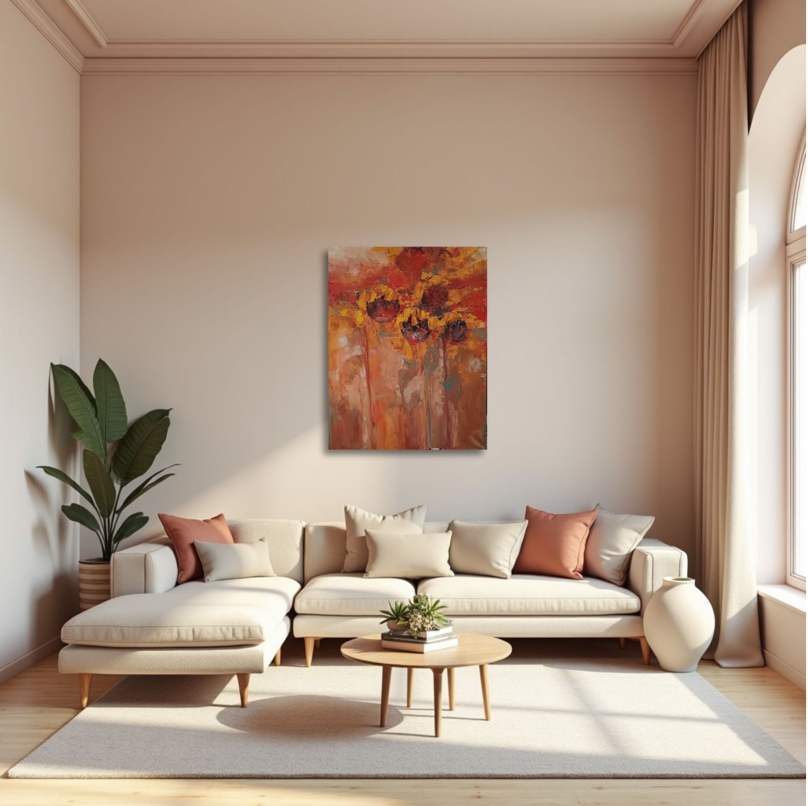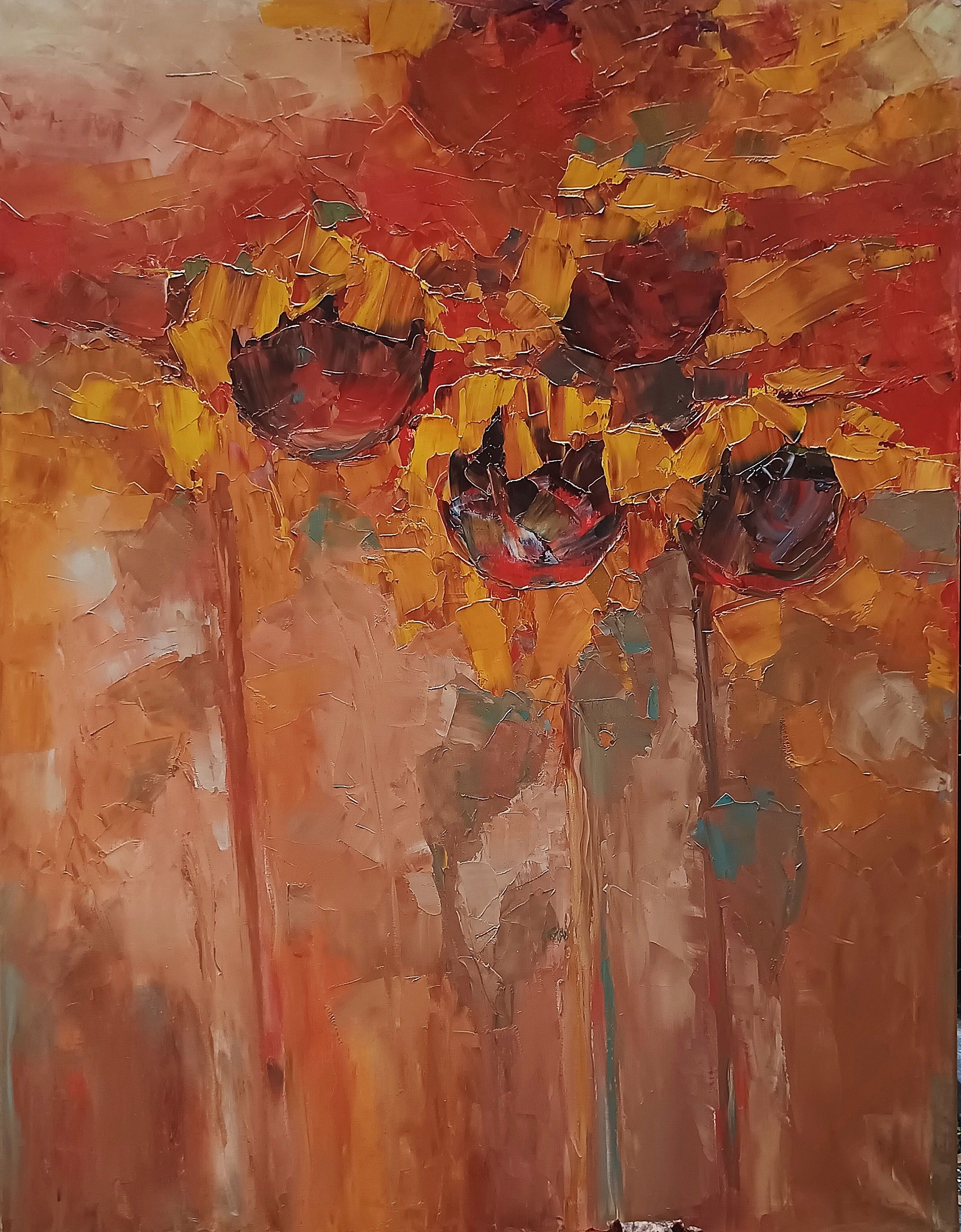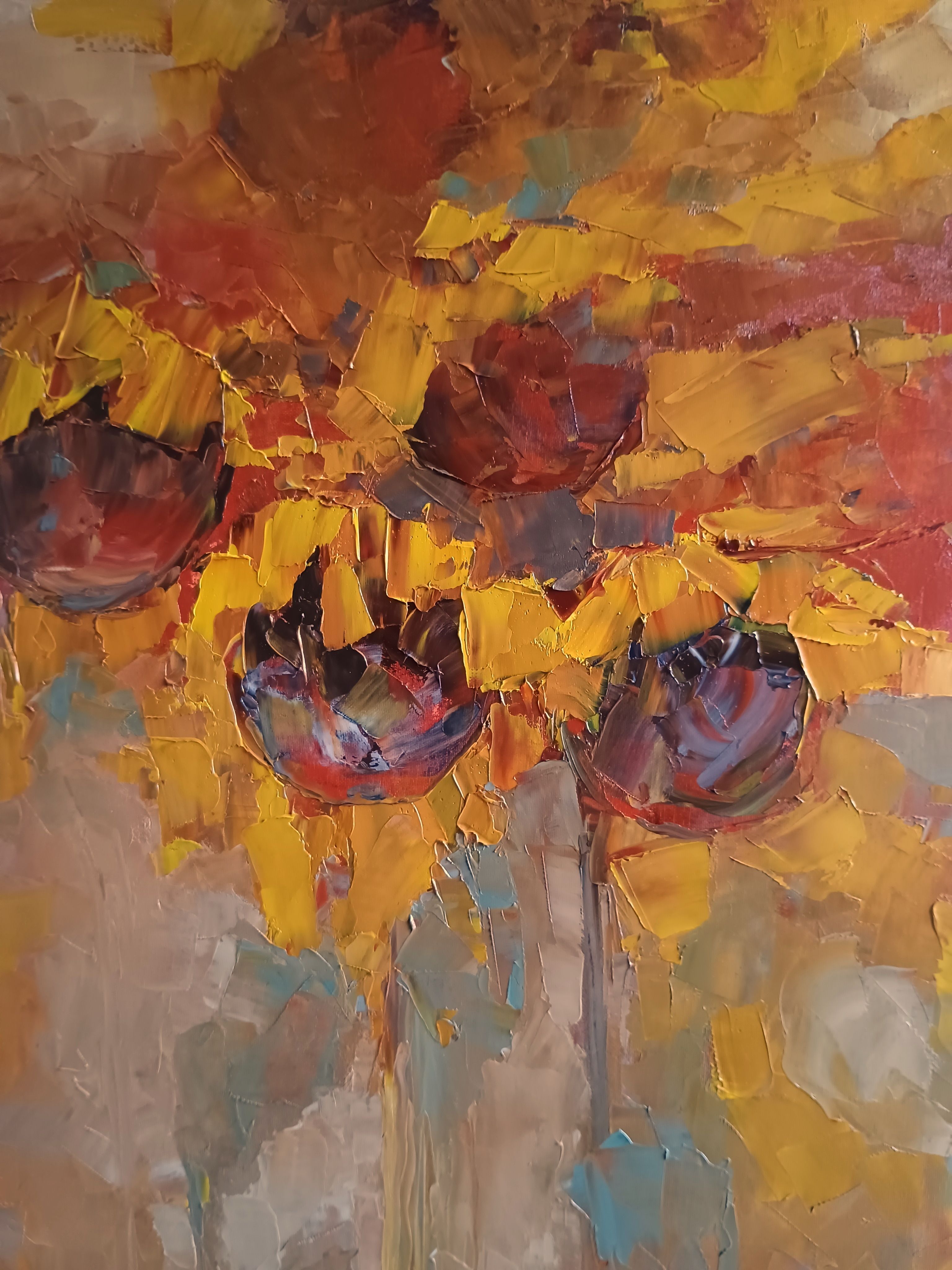 This painting is part of my recent solo exhibition held in my home town and presenting 38 paintings in the theme sunflowers. With this exhibition, I once again say how much I love the earth and its way of existence. All summer I pass by the sunflower field twice a day. I observed their life. I reflected. The sunflower lives only 5 months and experiences so many states, each of them in its true meaning and conscious passion. I saw steadfastness, dedication and confidence. The parallel with our life was inevitable. What do we do with all this time we have. Do we realize how much time we have for so many things. What do we use or waste time for. What states do we fall into. Do we know that we are in them. Hence the name Stops. Because this is how we go through our lives. In a series of stops. And each of them has its own and independent meaning. Every period or even moment, every person we meet, carries something, has a role, has the right time. We stop somewhere or with someone. We stop in some feeling, in some thought, in some state. Do we understand how these states build us. How do we react to them and do we allow them to define us? Do we become them? Do we see how they change us or the people around us? That's why most of the paintings here have names for states. That was my way of making sense of them. Others have names and reflect types. They are permanent states or character traits, so to speak. And I found them in the different stages of the sunflowers. That was a lot of fun. This original oil painting is made on stretched cotton canvas. Size is 70x90cm. Depth 2 cm. Canvas is gallery wrapped and painted on the sides, so the painting could be hang as it is without a frame if preferred. The painting will be sent safely packed within 4 working days after the purchase. A certificate of authenticity will be enclosed.